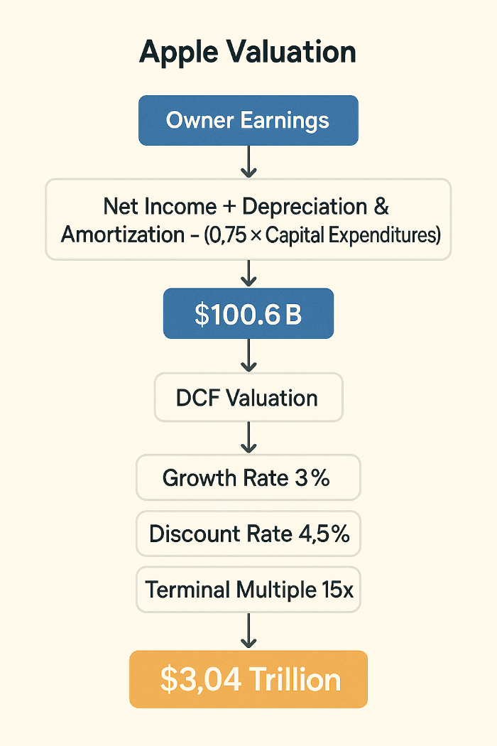 - Owner Earnings = $97.3B + $11.5B - (0.75 × $10.9B) = $100.6B